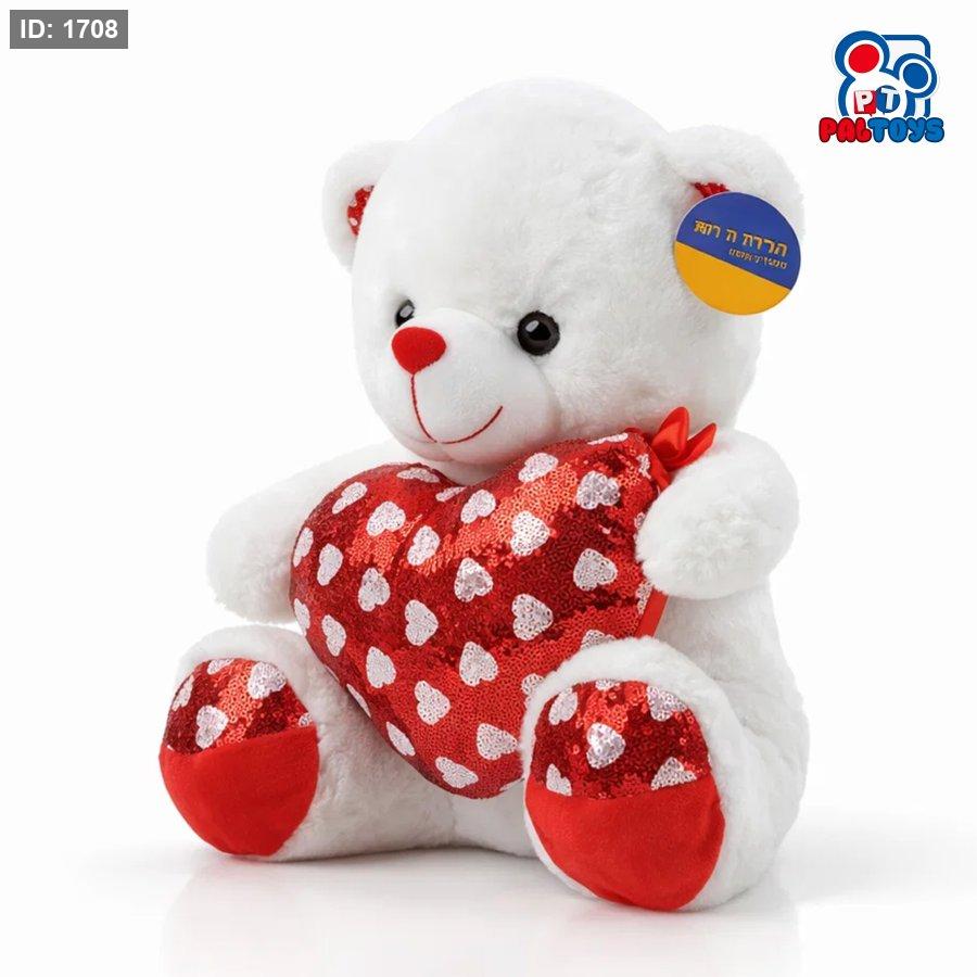 تيدي الحب الأحمر – دبّ ناعم الملمس، بلون أبيض أنيق يحمل قلب أحمر لامع مليان مشاعر.