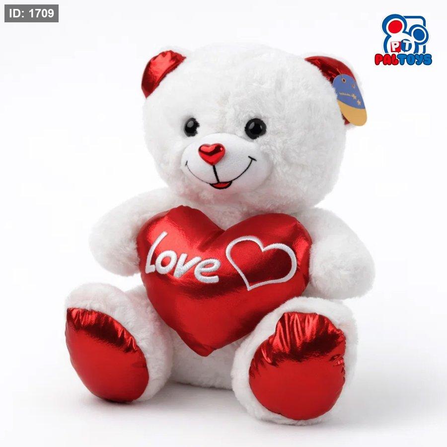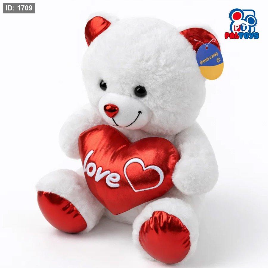 تيدي الحب الأحمر – دبّ ناعم الملمس، بلون أبيض أنيق يحمل قلب أحمر لامع مليان مشاعر.